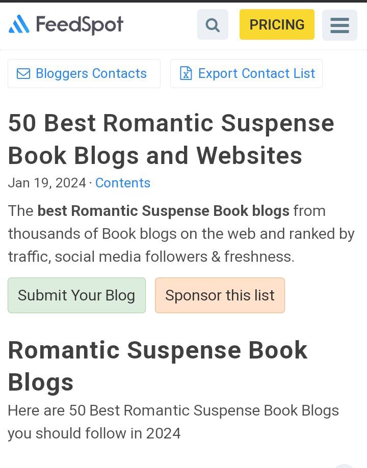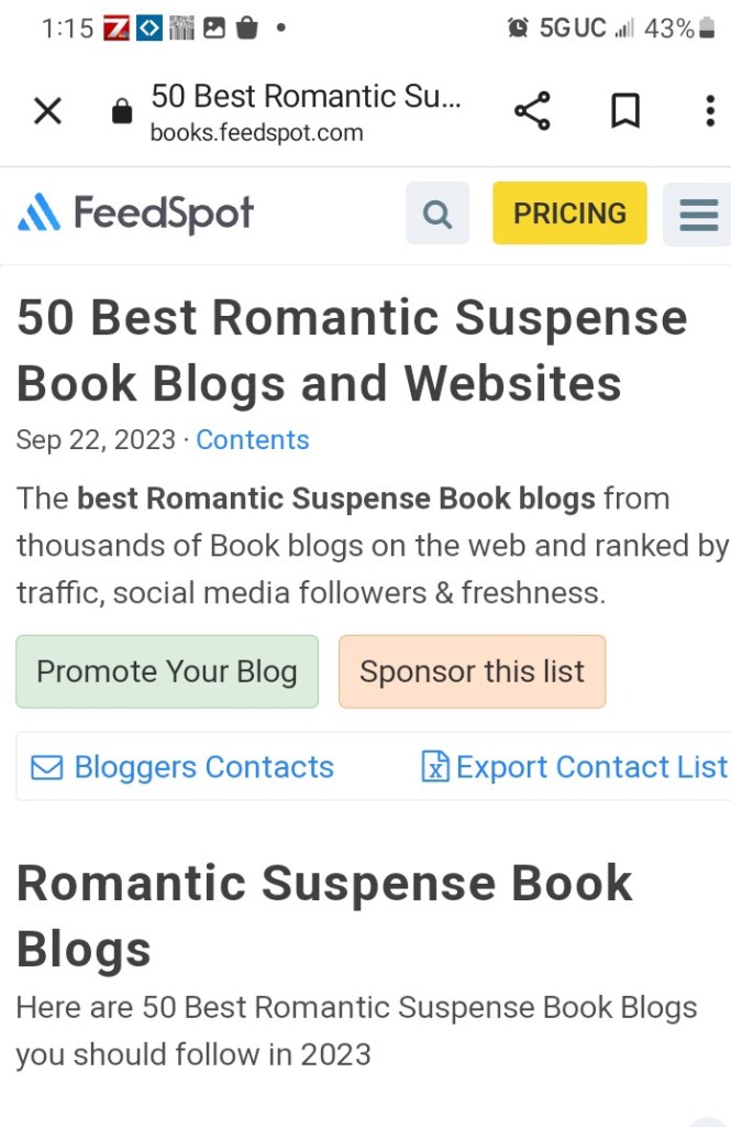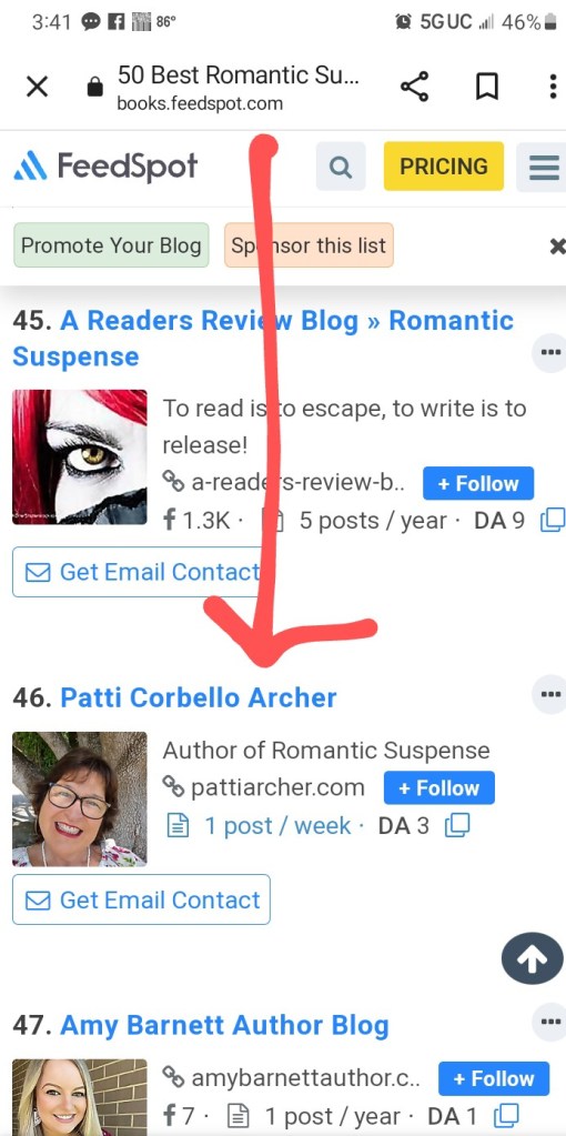 It might not seem like much to some, but I’m thrilled. Several months ago I found that I was #49 on the top 50 list of romantic suspense book blogs. And today I’m #39! Yay!! I’m moving up!!