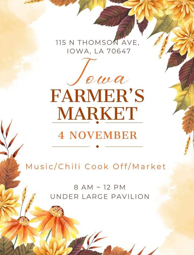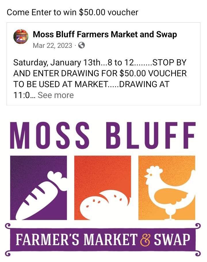 8 to12, at the Moss Bluff Farmer’s Market and Swap next to McDonald’s.